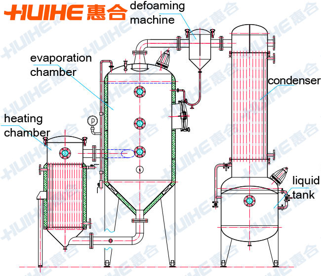 The single effect outer cycle vacuum concentrator is composed of heater, evaporator, defoamer, condenser, cooler and liquid receiving tank. The parts that contact materials are all made of stainless steel. The equipment is applicable to evaporation and concentration of liquid materials in pharmacy, food, chemical industry, light industry and etc. The concentrating time is short and the evaporating speed is high, which can better protect the heat sensitive materials from being damaged.