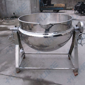燃?xì)鈯A層鍋:就是人工打開氣閥,點(diǎn)燃燃?xì)猓尤胧秤糜,待油溫達(dá)到烹飪溫度時(shí),加入適量的物料,人工翻鍋、攪拌,使物料在鍋里均勻受熱。待物料加工完畢后,關(guān)氣熄火,轉(zhuǎn)動(dòng)手柄,通過蝸輪、蝸桿傳動(dòng)裝置,使鍋體旋轉(zhuǎn)傾斜,將物料倒入另一容器內(nèi)。