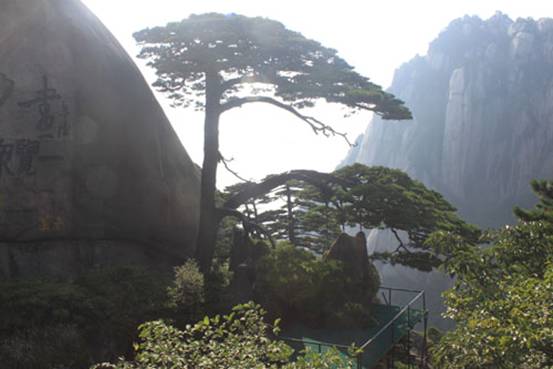 黃山迎客松,800多年的樹齡,樹干中部伸出長達7.6米的兩大側枝展向前方,恰似一位好客的主人,揮展雙臂,熱情地歡迎五湖四海的賓客到黃山游覽。